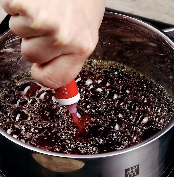 2.) Gib das Wasser zusammen mit Zucker und Zitronensaft in einen Topf und lass diese Mischung auf dem Herd karamellisieren. Wenn du ein Kochthermometer nutzt, solltest du circa 110 °C anpeilen. Jetzt fügst du die Lebensmittelfarbe hinzu.