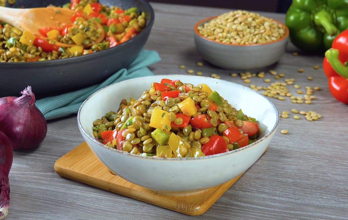 So geht es: Koche die eingeweichten Linsen in der Brühe, bis sie gar sind. Schneide dann Zwiebeln, Paprika und Jalapeños klein und schwitze sie in einer Pfanne mit Öl an. Gib anschließend die Linsen und die halbierten Dattel-Cherrytomaten hinzu. Würze alles mit Thymian, Oregano, Salz und Pfeffer. Am besten schmeckt der Salat, wenn er noch lauwarm ist. Als Topping kannst du ein paar Scheiben Avocado dazu servieren.