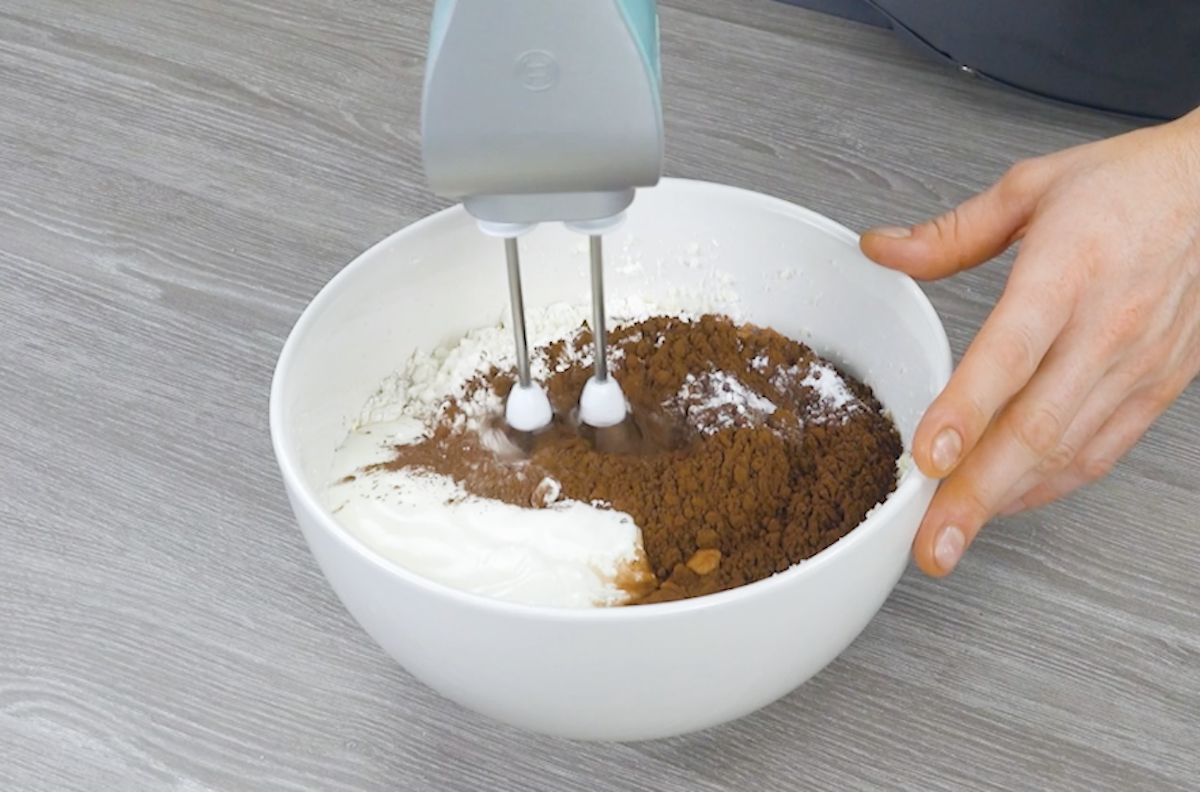 1. Schlage Butter mit Zucker schaumig auf, bis eine weiße Masse entstanden ist. Gib ein Ei hinzu und schlage alles weiter auf höchster Stufe. Gib dann Mehl, Backpulver, Kakaopulver, Natron, Joghurt sowie Milch hinzu und vermenge alles miteinander, bis der Teig leicht cremig ist.