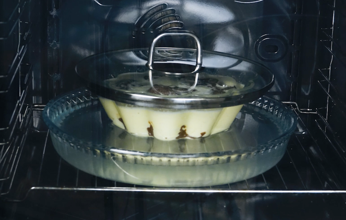 4. Stelle die gefüllte Gugelhupfform in eine größere Back- oder Auflaufform und fülle diese halbvoll mit heißem Wasser. Lege einen Deckel auf die Gugelhupfform und schiebe alles bei 180 °C Ober- und Unterhitze für 90 Minuten in den Ofen. Lasse den Schoko-Flan-Kuchen nach dem Backen mindestens 2 Stunden auskühlen.