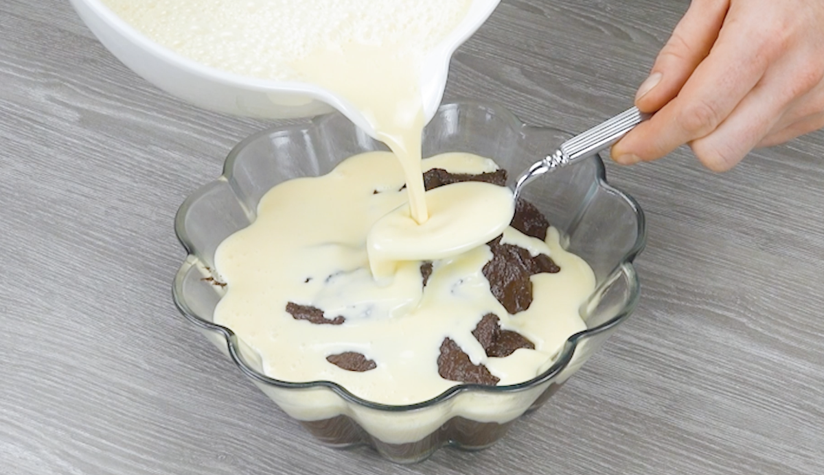 3. Mixe Eier mit Milch, Kondensmilch, Frischkäse und Vanilleextrakt auf höchster Stufe. Verteile die Flanmasse mithilfe eines Löffels vorsichtig auf dem Schokoteig in der Gugelhupfform.