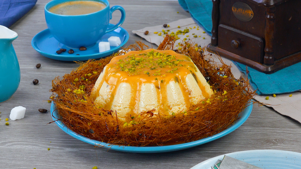 6. Stürze den Schoko-Flan-Kuchen und dekoriere ihn mit Engelshaar, gehackten Pistazien und der Karamellsauce.
