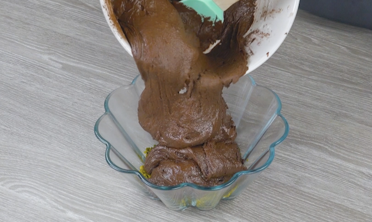 2. Gib gehackte Pistazien in die Gugelhupfform und verteile darauf vorsichtig den Schokoteig. Klopfe die Form etwas an, sodass sich der Teig gleichmäßig verteilt.