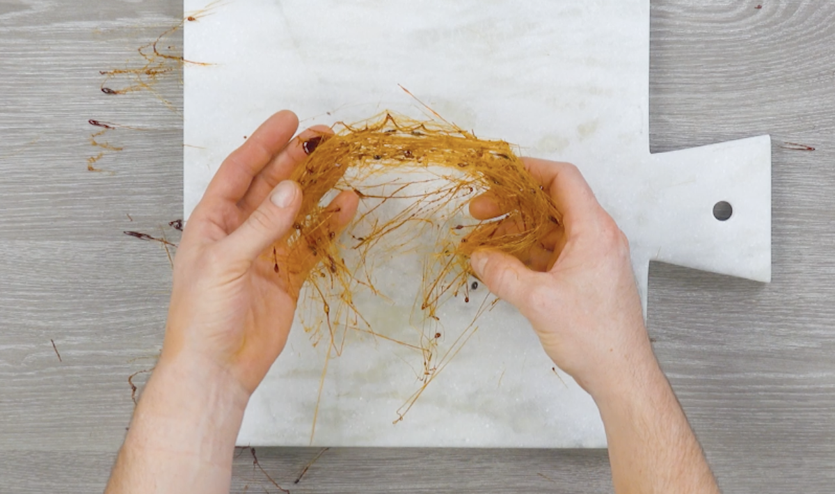 5. Für das Engelshaar gibst du Zucker mit Wasser in einen Topf und lässt den Zucker langsam karamellisieren, bis er leicht goldfarben geworden ist. Schwenke das flüssige Karamell mit einer Gabel über eine Metall- oder Steinplatte (auf Holz klebt es fest). Bringe die Karamellfäden mit den Händen behutsam in eine Ringform. Zu dem restlichen Karamell im Topf gibst du einfach Sahne hinzu und lässt es kurz aufkochen, so kannst du zum Flan auch gleich eine Karamellsauce servieren. Lasse die Sauce etwas abkühlen.