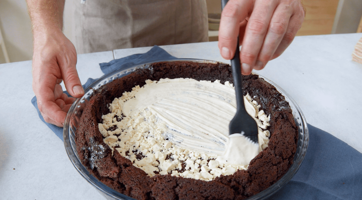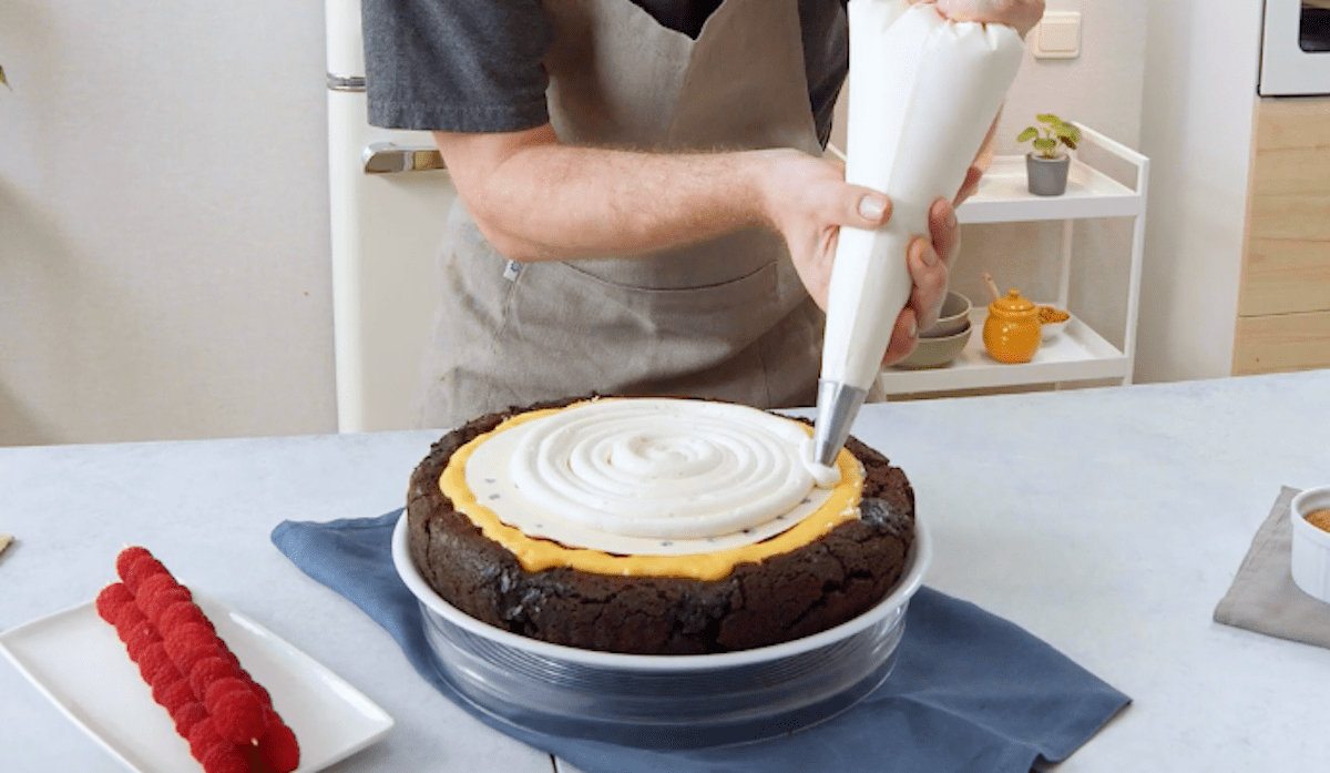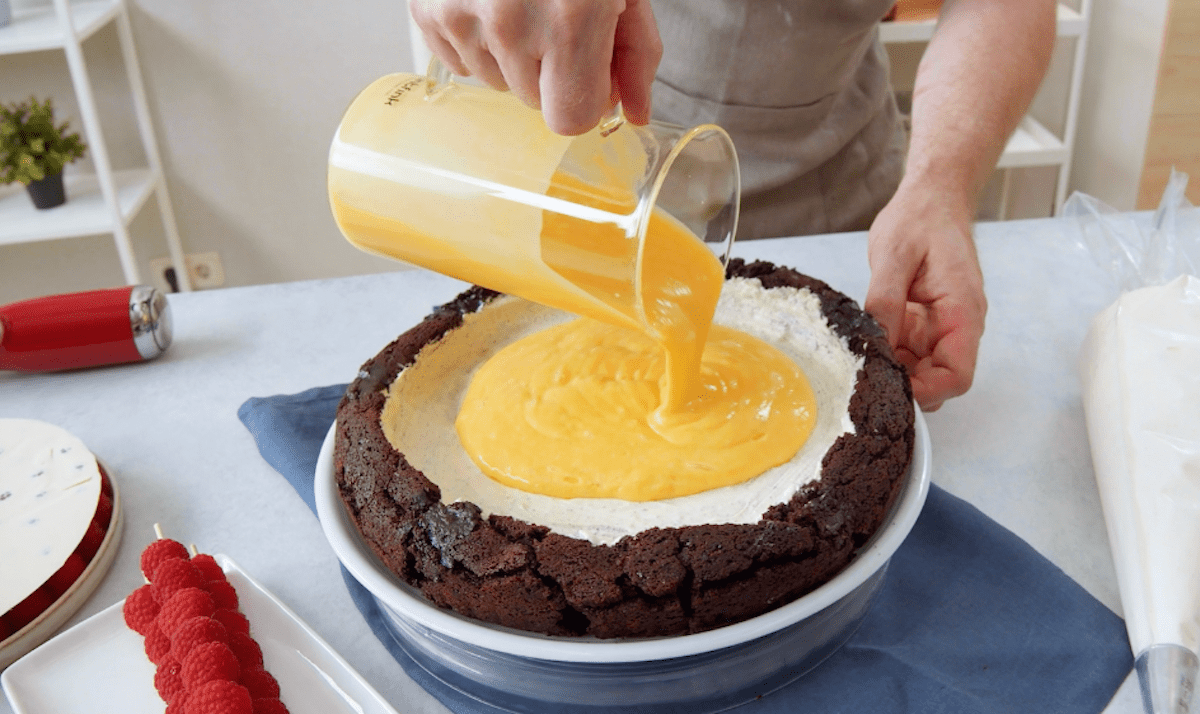 7. Fülle die Mangocreme in die Mulde des Brownie-Kuchens.
