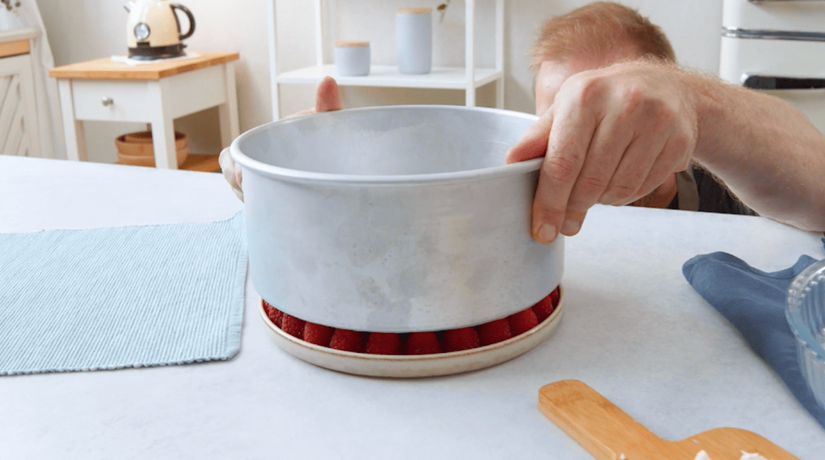 3. Stürze den Kuchen danach in die Tarteform und drücke mittig mit einem Topf oder einer anderen geeigneten Form eine Kuhle in ihn. Gib die gehackte weiße Schokolade in die Kuhle, lass sie schmelzen und verteile sie dann mit einem Pinsel. Nun muss der Kuchen ca. 2 Stunden auskühlen.