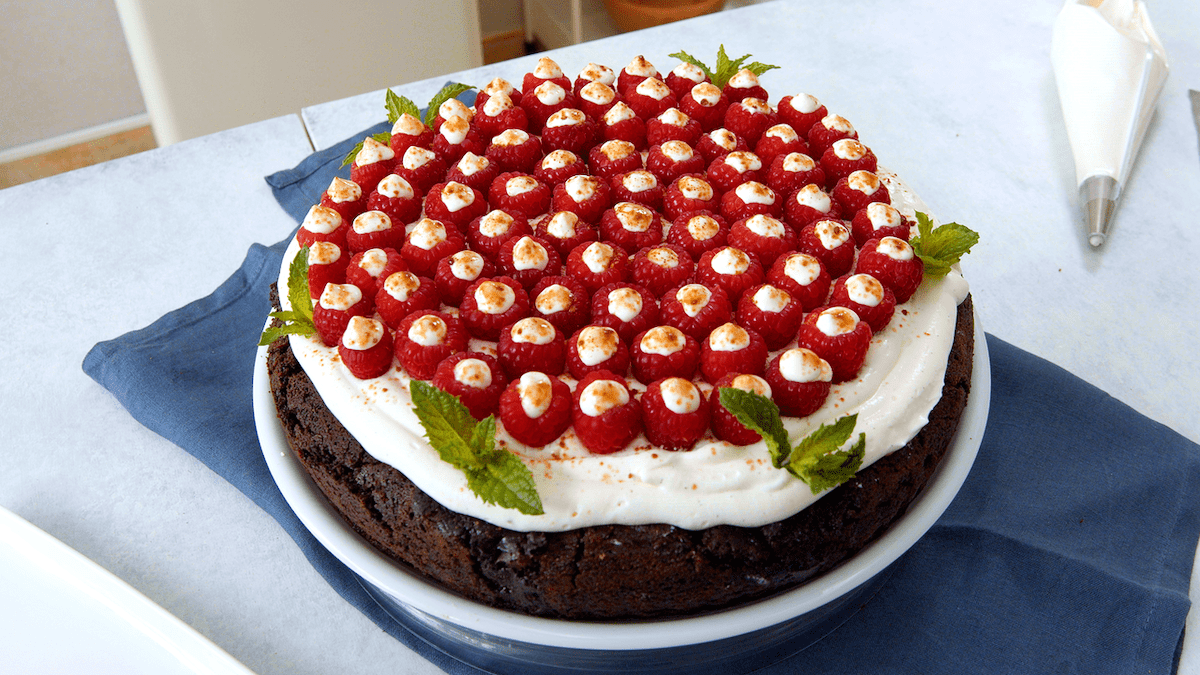 Die Zubereitung dieses Kuchens ist zwar ein bisschen anspruchsvoller, aber dafür entschädigt er durch seinen wunderbaren Geschmack. Der saftige Brownie-Boden geht mit der fruchtigen Creme und den Himbeeren einfach eine exquisite Kombination ein.