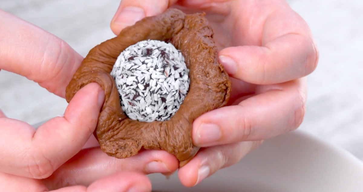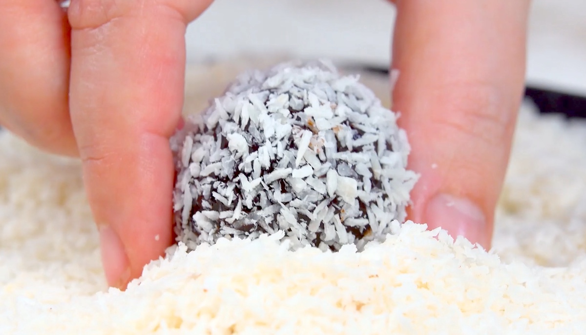 3. Fette deine Hände ein und forme aus der Masse zwölf gleich große Kugeln, walze die Brigadeiros dann durch die Kokosraspel.