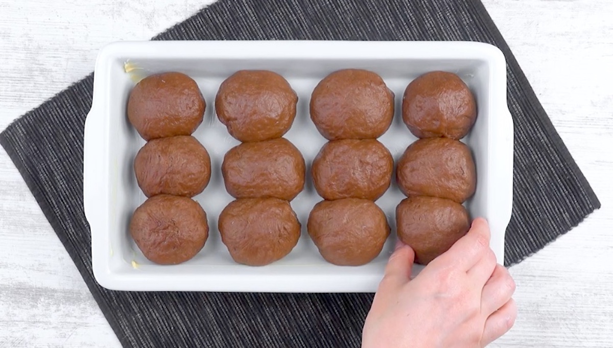 5. Lege nun die mit Brigadeiros gefüllten Schokobrötchen in eine eingefettete Auflaufform und lass sie darin für 30 Minuten abgedeckt gehen.