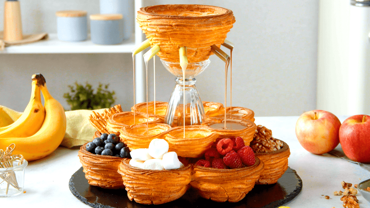 Ein Schokobrunnen mit zartschmelzender Schokolade und frischen Früchten? Allein die Vorstellung klingt unwiderstehlich lecker. Und es gibt ihn tatsächlich! Unser Schokobrunnen besteht komplett aus Brandteig. Damit sieht er nicht nur originell aus, sondern es bleibt von ihm auch garantiert kein Krümel übrig.