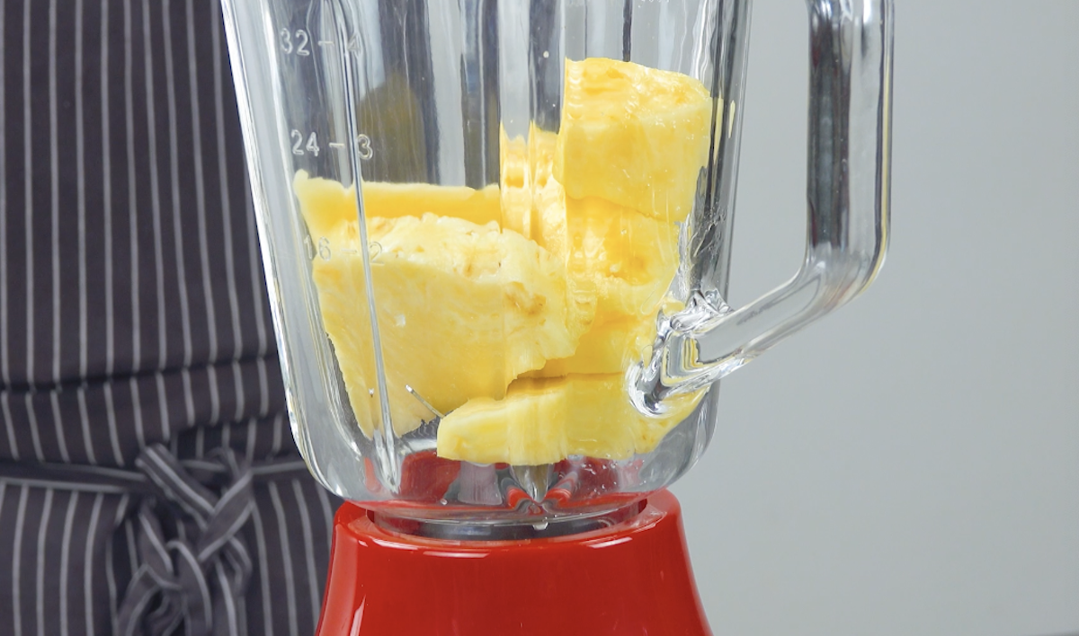 5. Schäle die Ananas und halbiere sie einmal. Koche die Ananas für ca. 1 Minute in heißem Wasser (Ananas reagiert mit Milchprodukten auf Grund bestimmter Enzyme, daher kochst du sie am besten 1 Minute in heißem Wasser, bevor du sie weiterverarbeitest). Von der einen Hälfte schneidest du das Fruchtfleisch grob in Stücke und pürierst es in einem Mixer. Die andere Hälfte wird in Scheiben geschnitten.