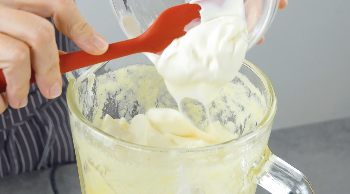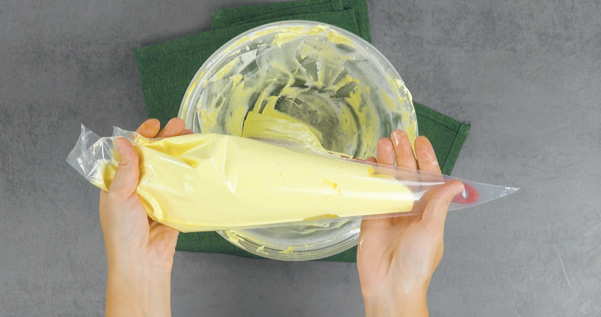 1. Als Erstes bereitest du die Ananas-Meringue zu. Heize den Ofen schon einmal bei Ober- und Unterhitze auf 100 °C vor. Schlage das Eiweiß mit einer Prise Salz auf und erhitze in einem Topf Wasser mit Zucker auf 121 °C. Lass das Zuckerwasser in das Eiweiß tropfen und rühre alles so lange, bis die Eiweißmasse Zimmertemperatur hat. Füge außerdem ein paar Tropfen gelbe Lebensmittelfarbe hinzu. Fülle die Ananas-Meringue dann in einen Spritzbeutel.