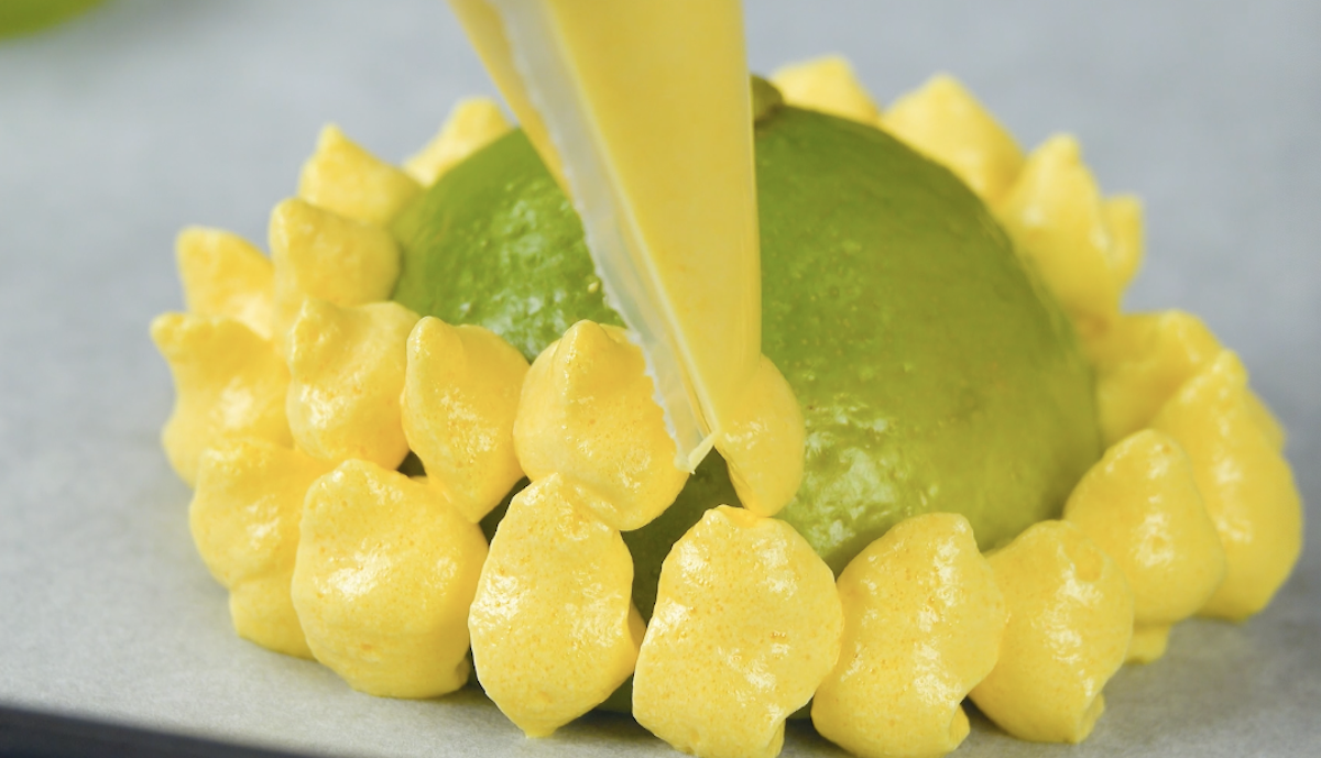 2. Lege drei Limettenhälften mit der Schnittkante nach unten auf ein mit Backpapier ausgelegtes Backblech und spritze die Ananas-Meringue tupfenförmig auf die Schalen, bis sie im Ganzen bedeckt sind. Schiebe das Blech bei 70 °C Umluft für 6 Stunden in den Ofen.