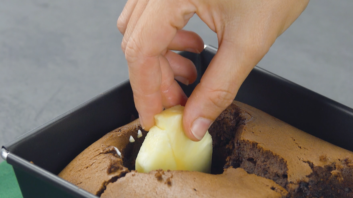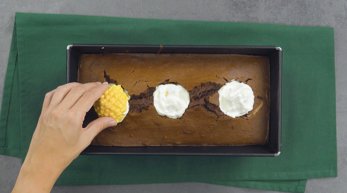 7. Entferne die Gläser aus dem gebackenen Kuchen und nimm ihn aus der Kastenform heraus. Fülle die Löcher mit der Ananascreme und jeweils 2 halben Ananasscheiben.
