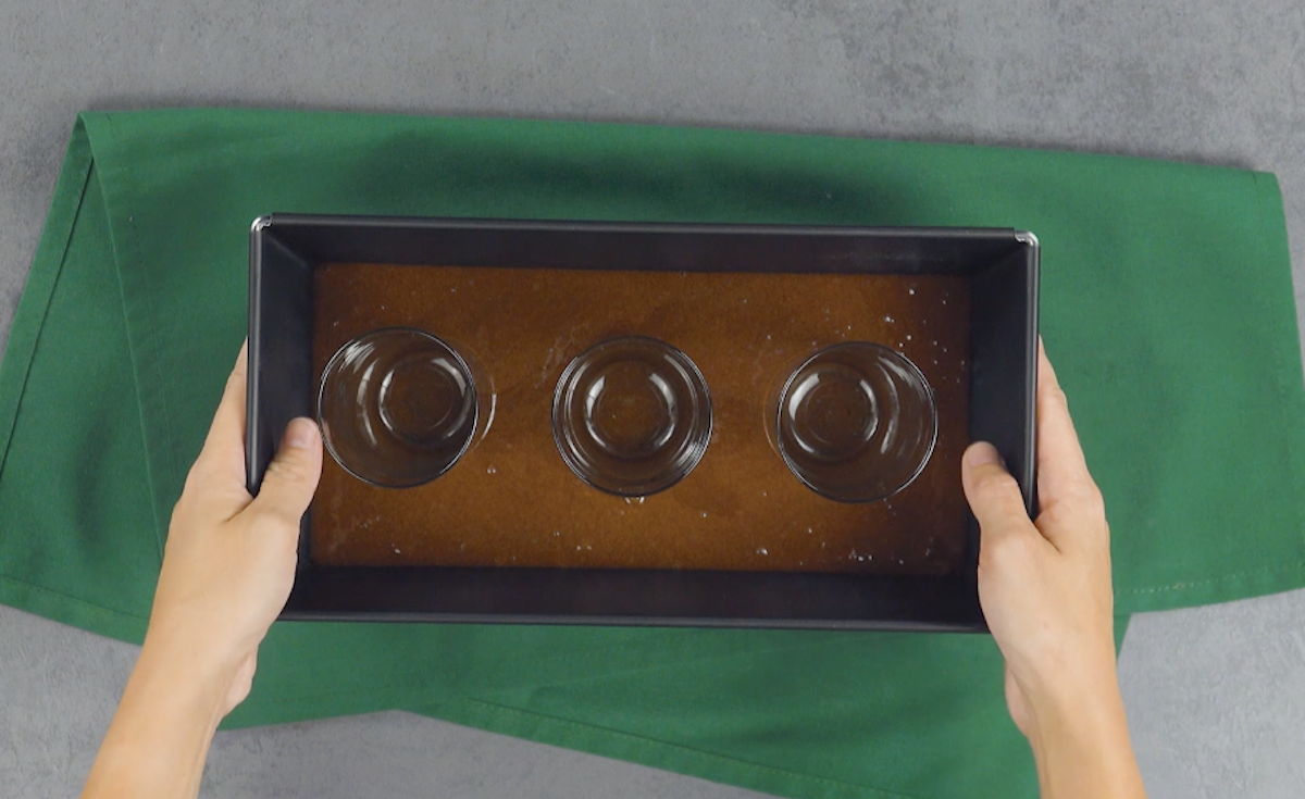 4. Kommen wir nun zum Kuchen. Hier sollte der Backofen bei Ober- und Unterhitze auf 170 °C vorgeheizt werden. Trenne die Eier und schlage das Eiweiß mit einer Prise Salz steif. Rühre die Eigelbe mit Zucker schaumig. Vermische Kakao mit Mehl und Backpulver und hebe die Mischung vorsichtig unter die Ei-Zucker-Masse. Fülle den Teig in eine eingefettete Kastenform. Stelle außerdem 3 Gläser mit in den Teig, sodass 3 Mulden entstehen. Schiebe alles für 40 Minuten in den Ofen.