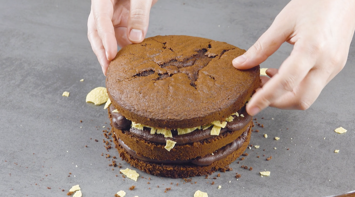 4. Lege auf die Chips einen weiteren Boden und verteile darauf wieder spiralförmig die Creme. Zerbrösele erneut die Kartoffelchips auf der Creme und lege zuletzt den dritten Kuchenboden obendrauf.