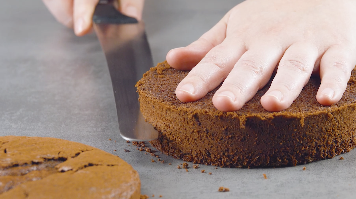 1. Schlage Eiweiß mit Zucker zu Schnee und stelle diesen erst einmal beiseite. Verrühre dann Butter mit den Eigelben und gib Mehl, Kakao und Stärke dazu. Nach und nach kannst du auch die Milch hinzugeben. Hebe dann den Eischnee mit einem Teigschaber unter. Gib den Teig in eine eingefettete Kuchenform und backe ihn für etwa 40 Minuten bei 175 °C Ober- und Unterhitze. Lasse den Kuchen dann abkühlen und schneide ihn in drei ca. 1,5 cm dicke Böden.