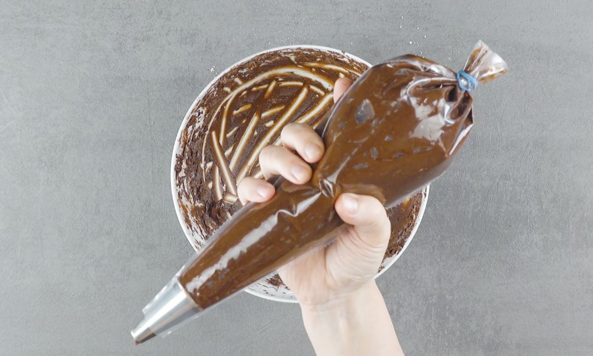 2. Verrühre nun die geschmolzene Zartbitterschokolade mit der weichen Butter und gib Kakao und Puderzucker hinzu. Zum Schluss rührst du den Frischkäse unter, bis keine Klümpchen mehr zu sehen sind und die Creme schön geschmeidig ist. Fülle die Creme anschließend in einen Spritzbeutel mit Tülle.