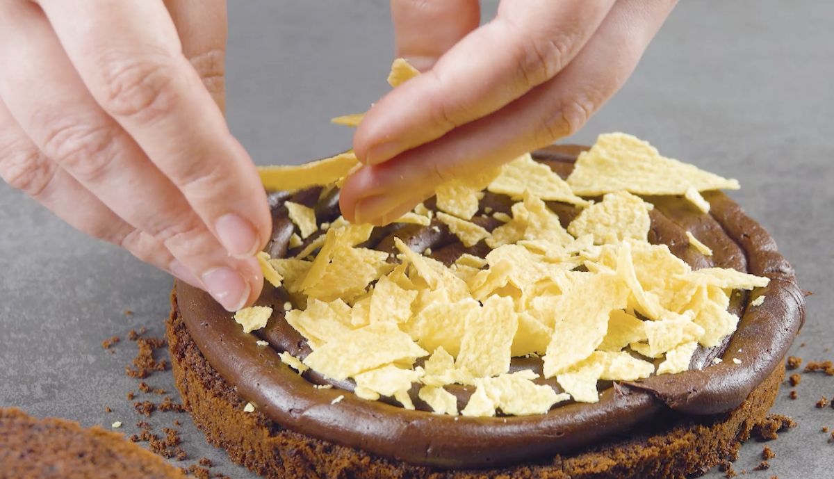 3. Drücke nun die Creme in Form einer Spirale auf einen der Kuchenböden und zerkrümele die Chips auf der Creme.