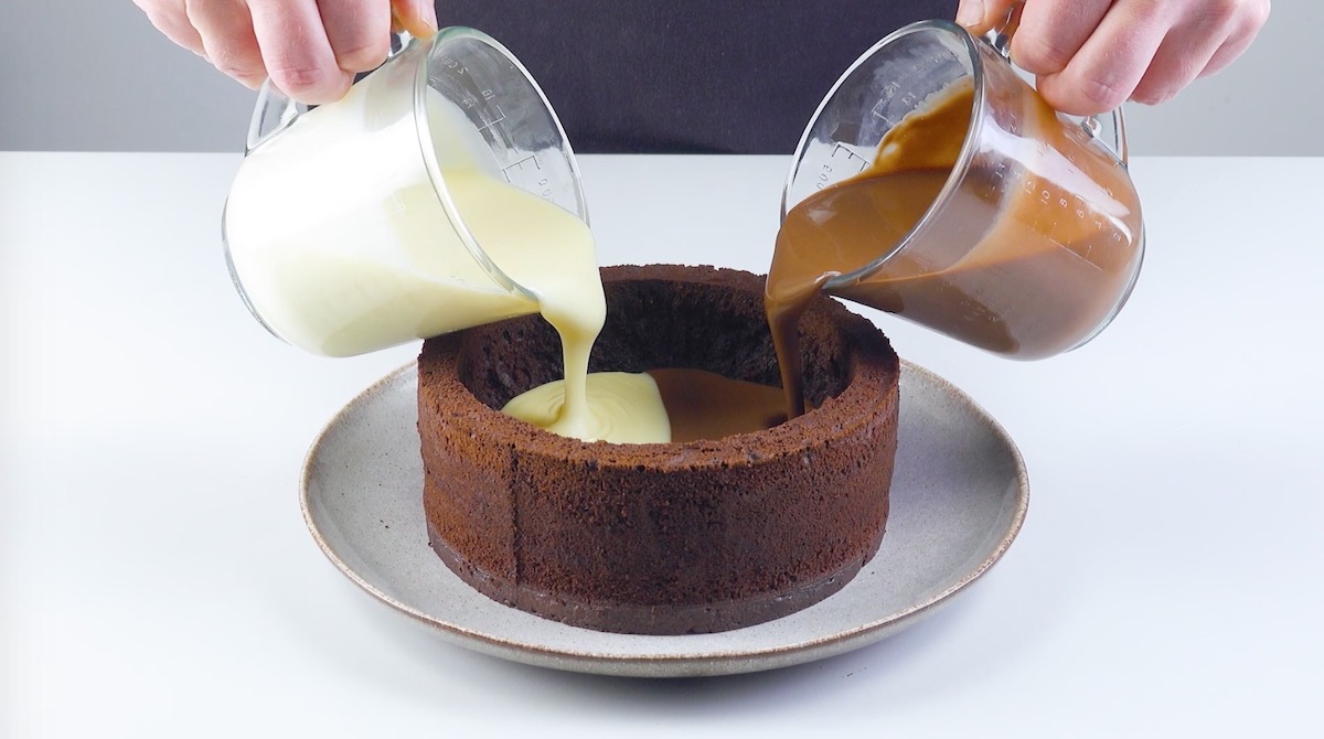 4. Verrühre Sahne mit Maisstärke und koche sie zusammen mit Milch und Kondensmilch in einem Topf auf. Verteile die noch heiße Masse gleichmäßig auf die beiden gehackten Schokoladensorten auf und rühre so lange mit einem Schneebesen um, bis die Schokoladen komplett geschmolzen sind. Gieße die geschmolzenen Schokoladen dann gleichzeitig von zwei Seiten in den Kuchen.