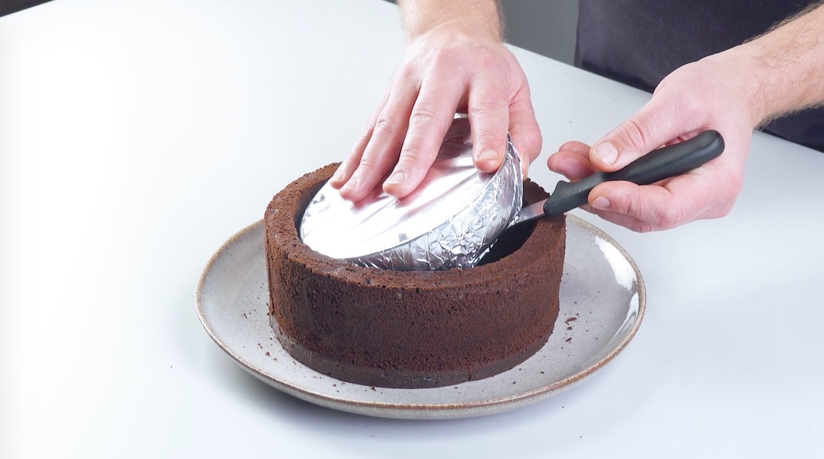 3. Lass den Schokoladenkuchen abkühlen. Stürze ihn dann und entferne vorsichtig die Springform sowie die Schale; schneide den oberen Rand des Kuchens gegebenenfalls gerade.
