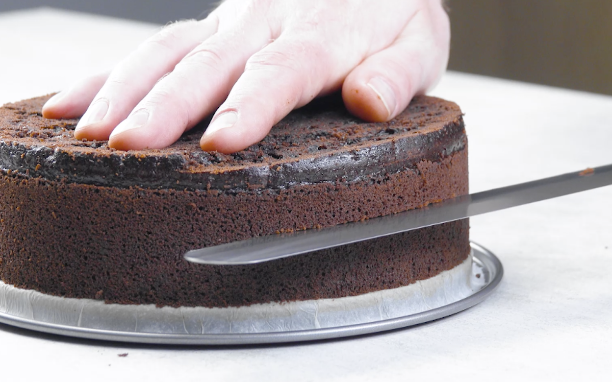 7. Schneide zunächst den „Deckel“ des Kuchens ab. Schneide den Kuchen dann horizontal in der Mitte durch.