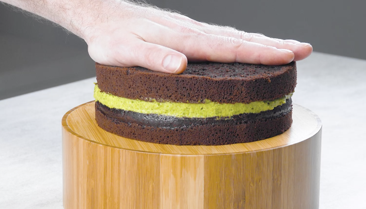 8. Nun beginnt der Zusammenbau. Verteile die Pistaziencreme auf der einen Kuchenhälfte und lege die andere Hälfte wieder obendrauf.