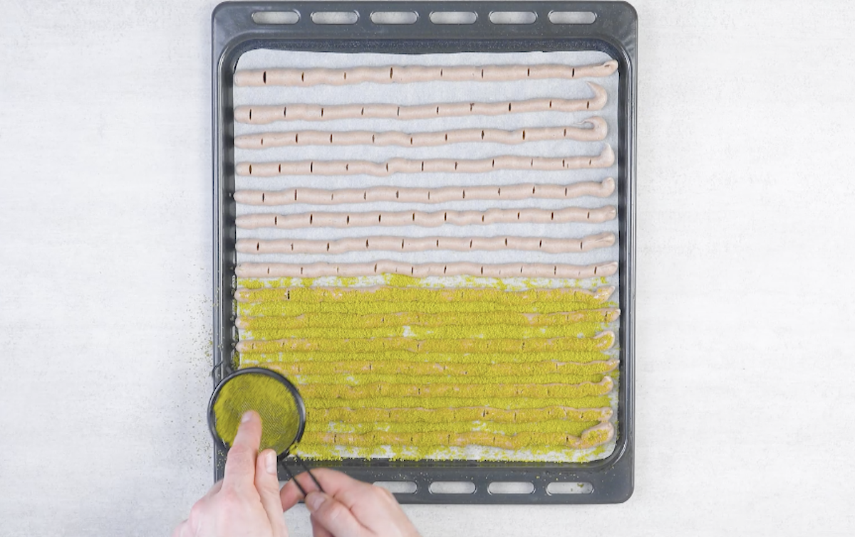 3. Heize den Ofen auf 140 °C Umluft vor und lege 2 Backbleche mit Backpapier aus. Fülle den Eischnee in einen Spritzbeutel (mit glatter 0,5-cm-Düse) und spritze einzelne Linien längs auf das Backblech (mit ca. 1 cm Abstand zueinander). Stelle das Blech ungefähr eine Stunde in den Ofen. Wenn das Baiser knusprig gebacken ist, ist es fertig. Lasse die Baiser-Sticks auf Raumtemperatur abkühlen.