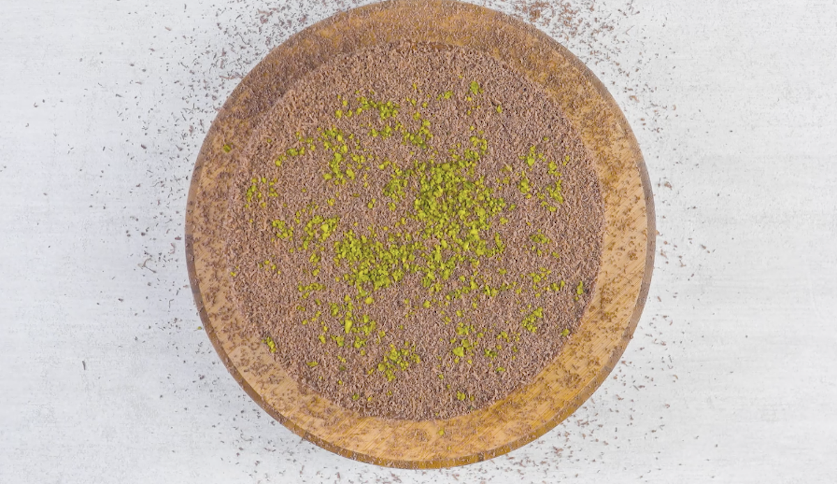 9. Ummantle nun den kompletten Kuchen mit der Schokocreme. Verteile Schokoraspel und klein gehackte Pistazien über den Kuchen.