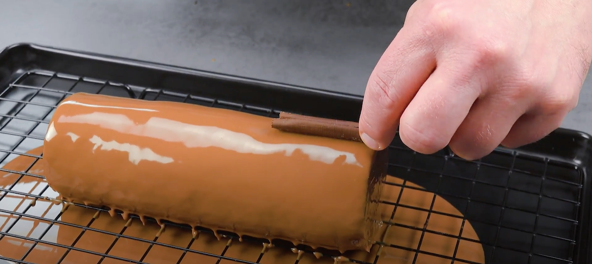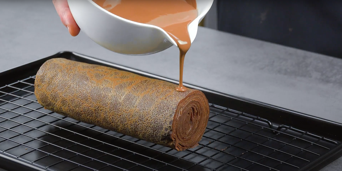 11. Ist die Kühlzeit vorüber, hole die Crêpe-Rolle aus dem Backpapier und schneide die Enden links und rechts gerade ab. Lege die Rolle auf einen Gitterrost, gib etwas zum Auffangen der Schokoladensoße darunter und gieße den temperierten Schokoladen-Überzug gleichmäßig über die Rolle.
