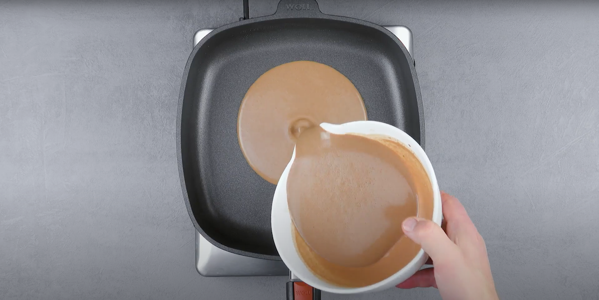 2. Schütte zur Sicherheit den Teig durch ein Sieb, damit sich im Teig keine Bläschen bilden. Fülle dann den Teig in die heiße Pfanne und stelle aus dem gesamten Teig 6 eckige Crêpes her.