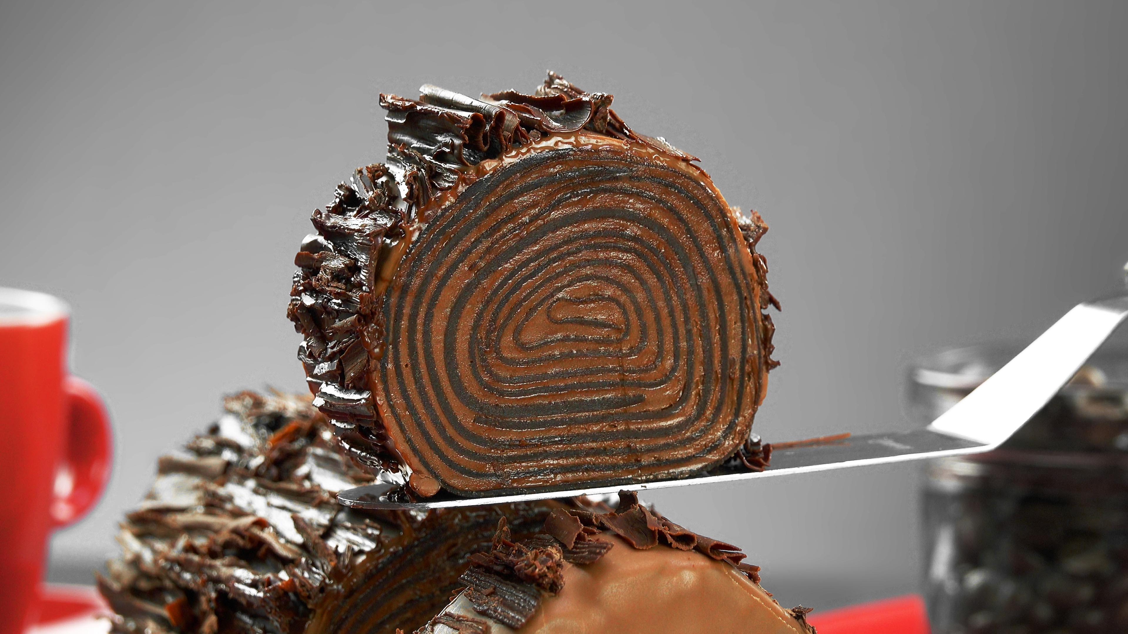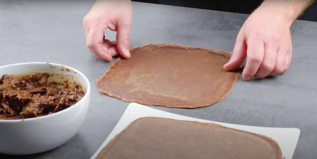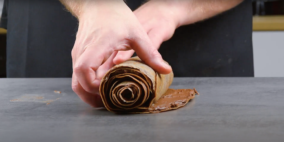 7. Rolle den fertig mit Schokoladen-Buttercreme eingestrichenen Crêpe ein, aber nur so weit, dass der nächste Crêpe auf den Rand des ersten aufgelegt werden kann.