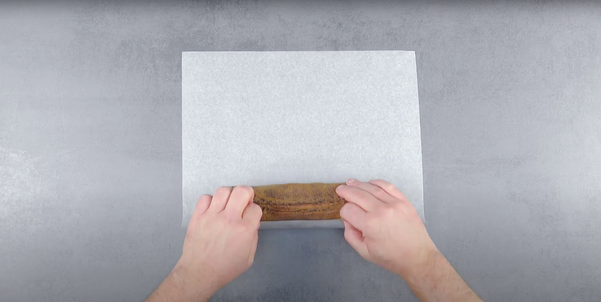 10. Lege die Rolle in Backpapier und wickle sie darin eng und kompakt ein. Drehe die Enden wie bei einem Bonbon ein. Stelle die in Backpapier eingewickelte Rolle für mindestens 2 Stunden – am besten jedoch über Nacht – kalt.