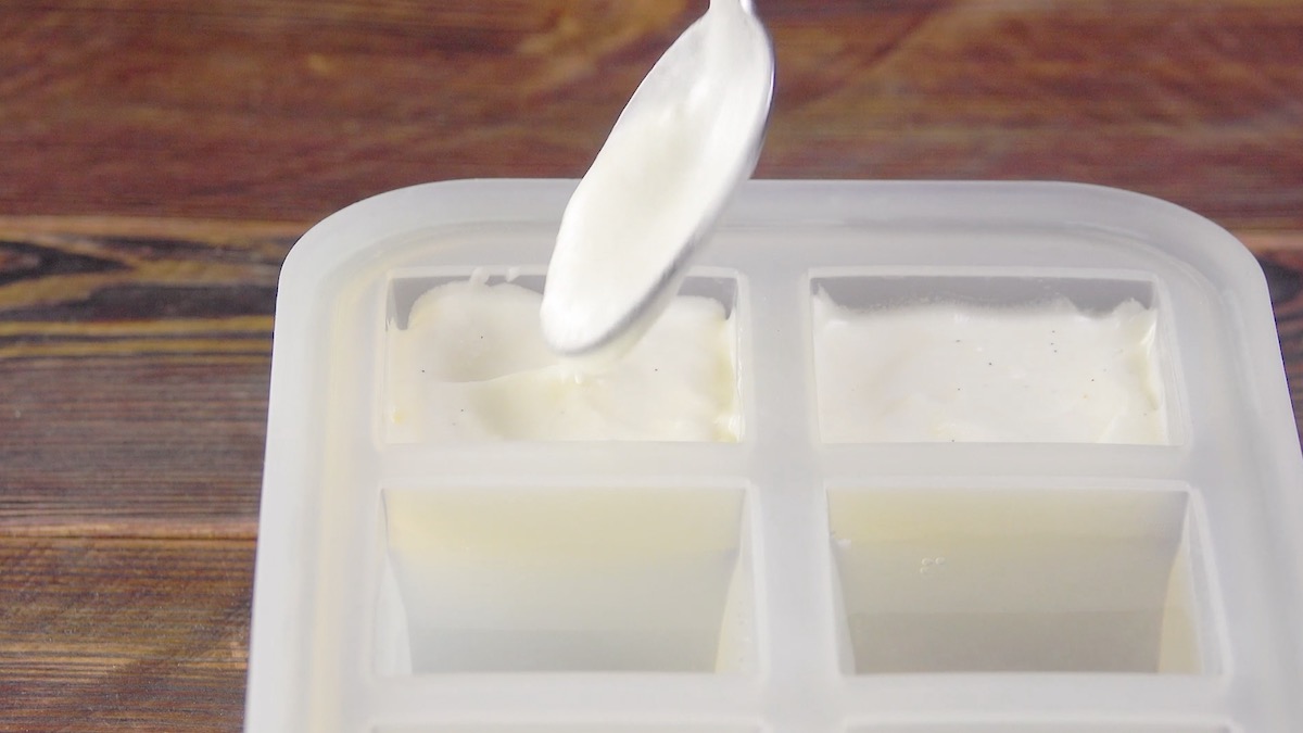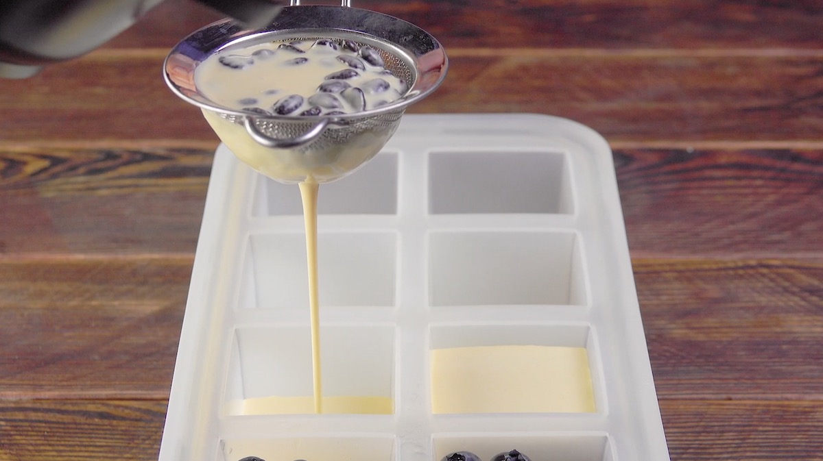 4.) Weiche die Gelatine ein. Erwärme währenddessen die Milch zusammen mit der Vanille, drücke dann die Gelatine aus und löse sie in der Vanillemilch auf. Zerhacke die weiße Schokolade und schmilz sie in der Milch. Hebe zum Schluss die Schlagsahne unter – fülle dieses weiße Schokomousse jetzt in die letzten zwei Eiswürfelkammern.