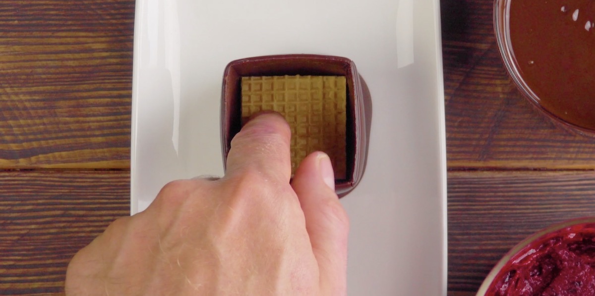 14.) Lege den Boden des weißen Schokoladenwürfels mit einem passenden Biskuitstück aus.