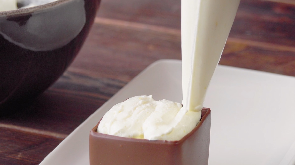 19.) Vermische für die Füllung den Frischkäse mit Vanillearoma, Zitronenabrieb und Schlagsahne. Befülle damit einen Spritzbeutel und spritze es in den Schokoladenwürfel.
