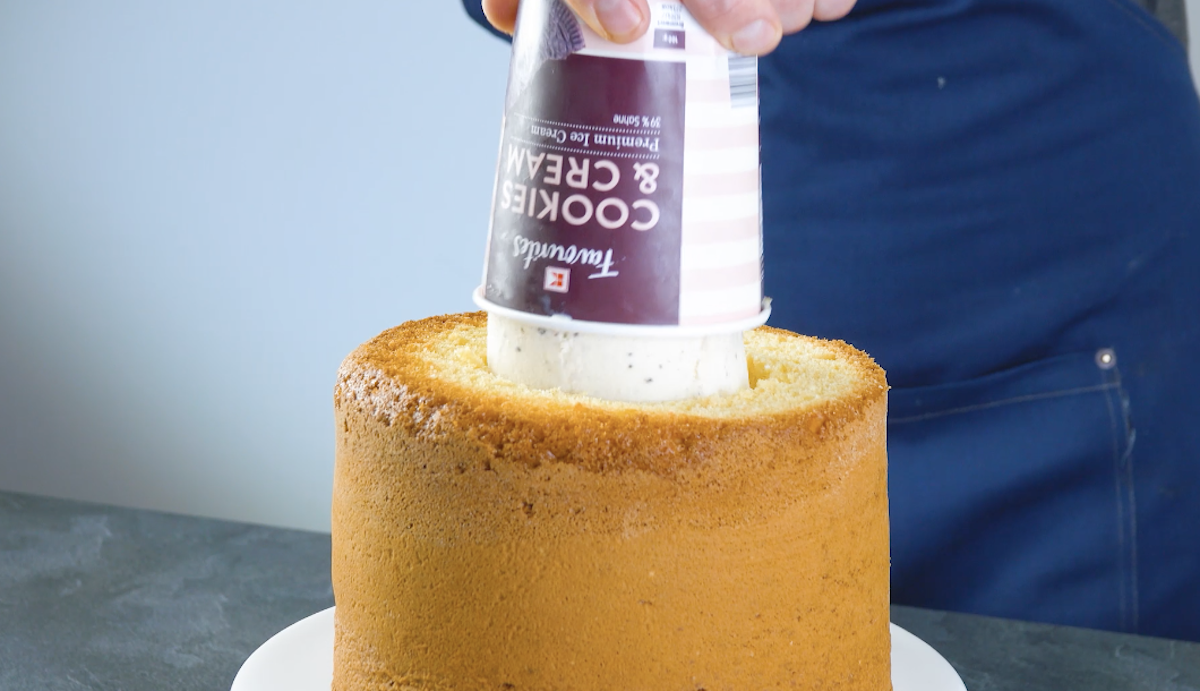 6. Löse die Eiscreme im Ganzen aus der Packung und führe sie in den ausgehöhlten Kuchen ein.