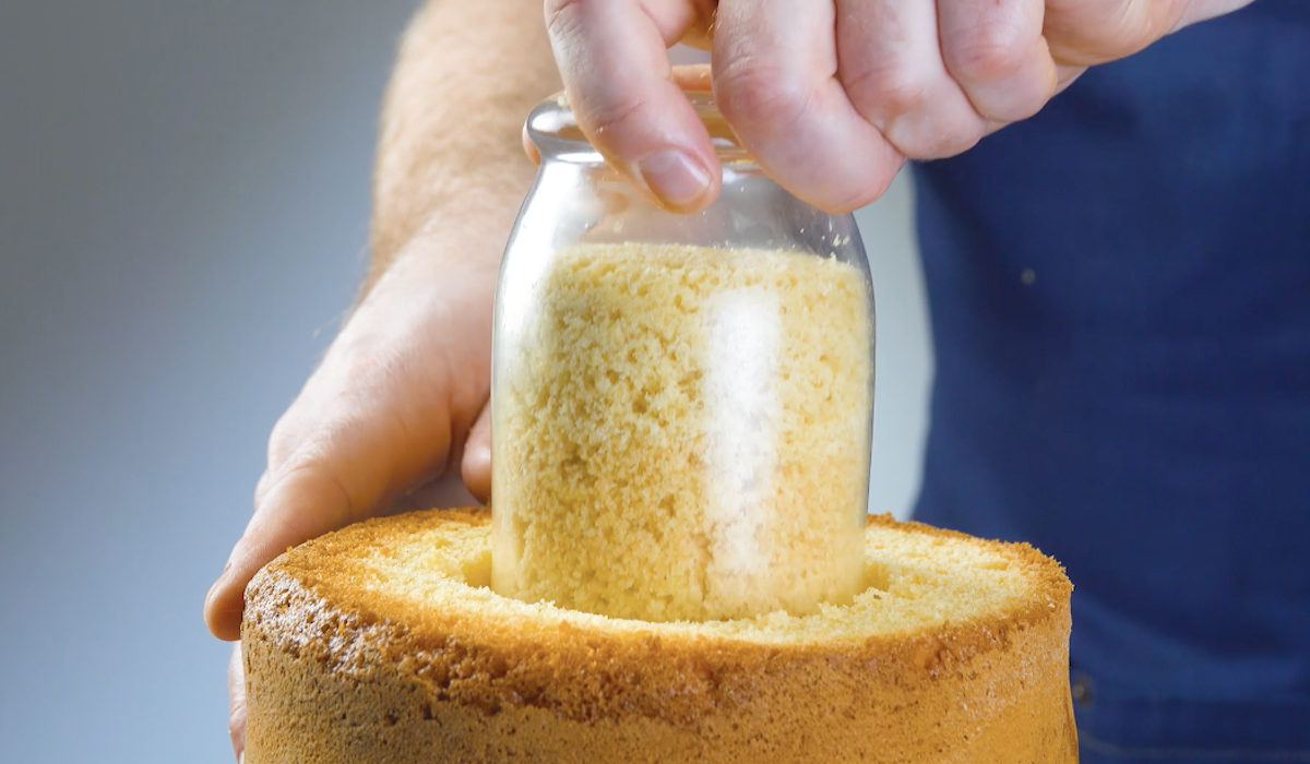 5. Baue nun den Kuchen zusammen. Schneide den „Deckel“ des Kuchens ab und höhle ihn mittig mit einem Glas aus.