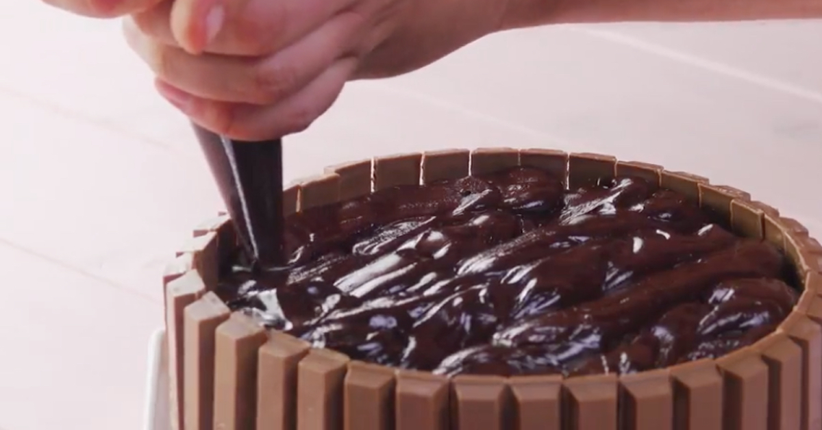 6.) Fülle die Oberfläche des Kuchens bis zum Rand des KitKat-Zauns mit Schokocreme.
