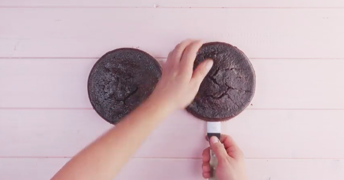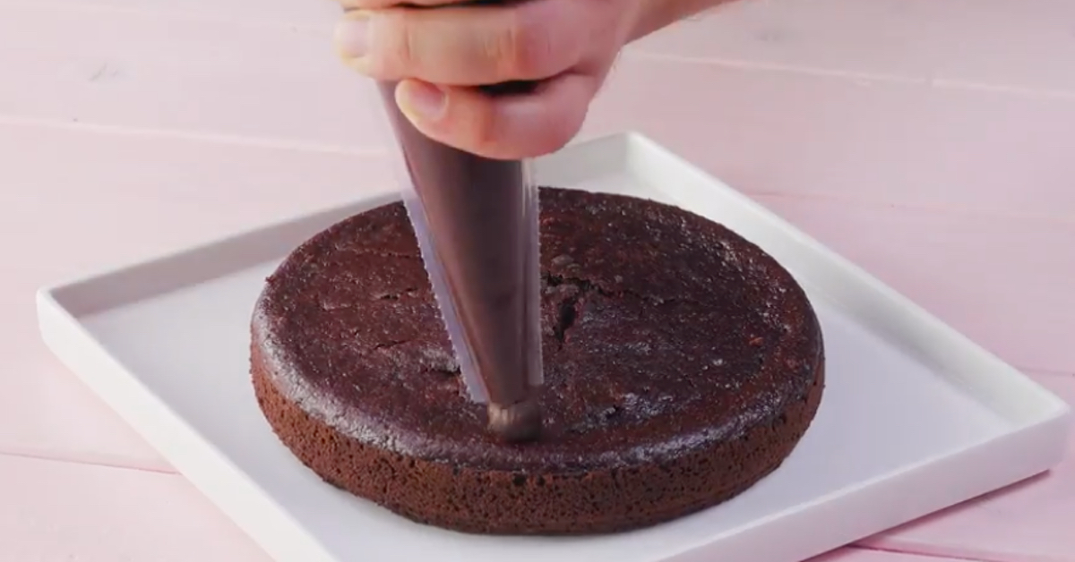 3.) Gib die Schokocreme in eine Spritztüte und verteile eine Schicht auf dem ersten Kuchen. Dann lege den zweiten darauf.
