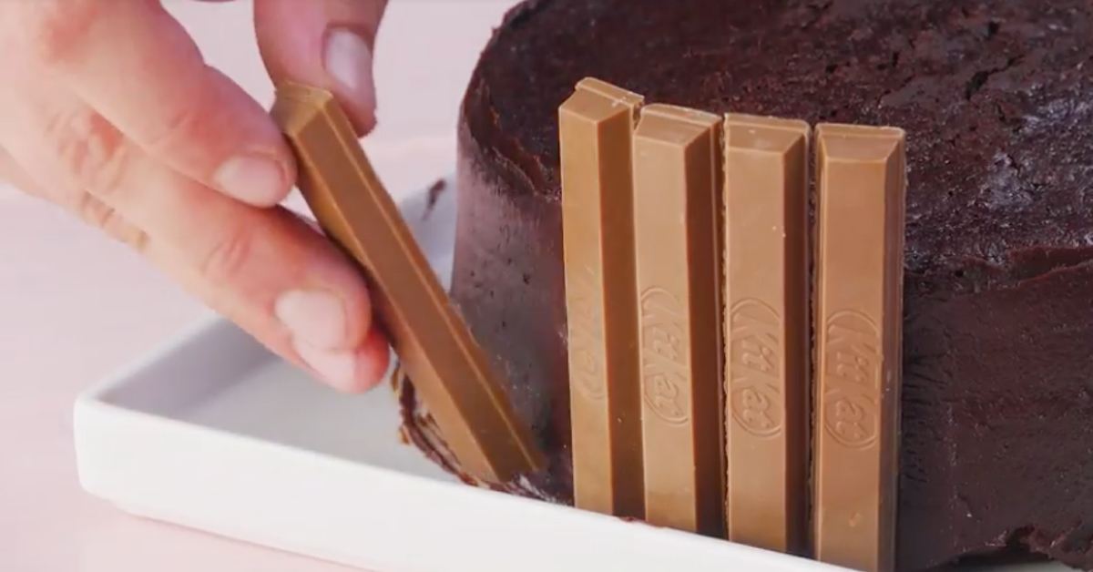 5.) Jetzt kommen die KitKats ins Spiel. Drücke sie senkrecht in die Schokocreme, bis der ganze Kuchen „eingezäunt“ ist.