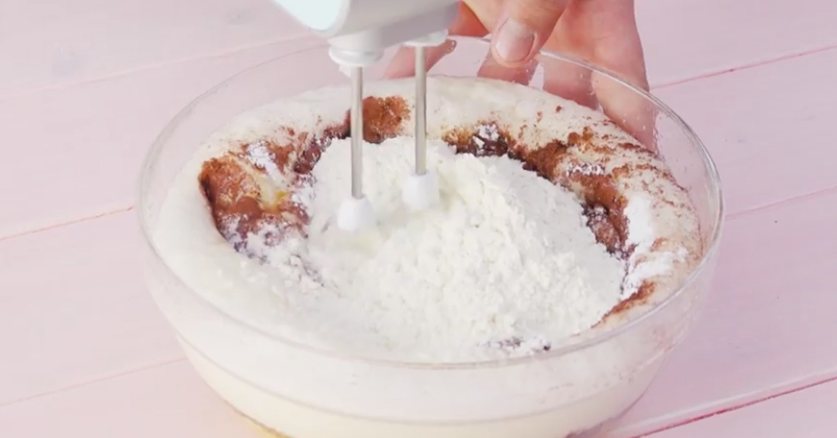 1.) Verrühre alle Zutaten für den Teig in einer großen Schüssel zu einer cremigen Masse. Heize währenddessen den Backofen auf 160Grad Ober/Unterhitze vor.