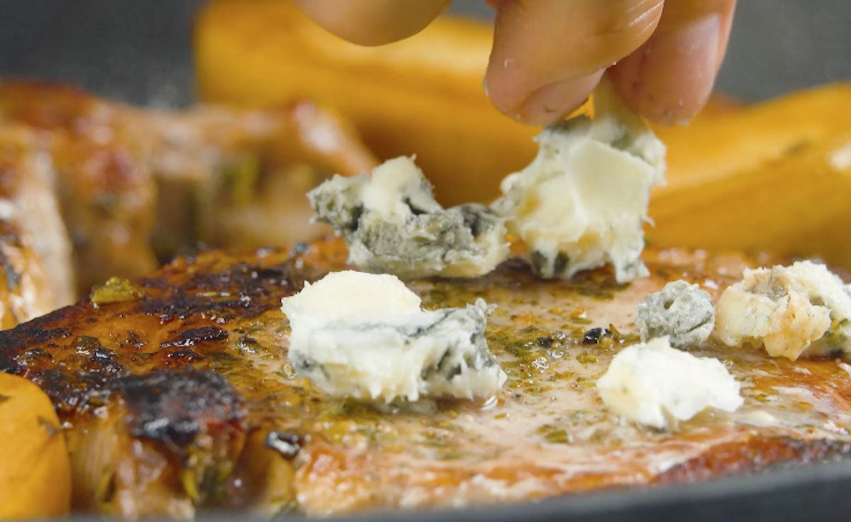 5. Reduziere die Hitze ein bisschen und füge Orangensaft, Zitronensaft und Honig zu den Schweinekoteletts hinzu. Zum Schluss kommt noch Butter mit in die Pfanne und klein gezupfter Gorgonzola auf das Fleisch. Lasse die Flüssigkeit in der Pfanne bei geringer Hitze eindicken.