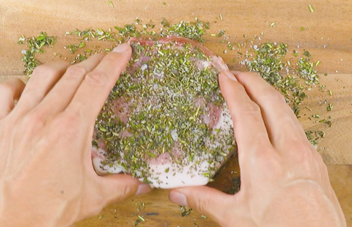 1. Als Erstes bereitest du die Kräutermarinade zu. Schneide Rosmarin und Thymian klein und gib Salz, Pfeffer und Zucker hinzu. Vermenge alles miteinander und verteile die Mischung auf einem Brett. Wälze nun die Schweinekoteletts in der Marinade.