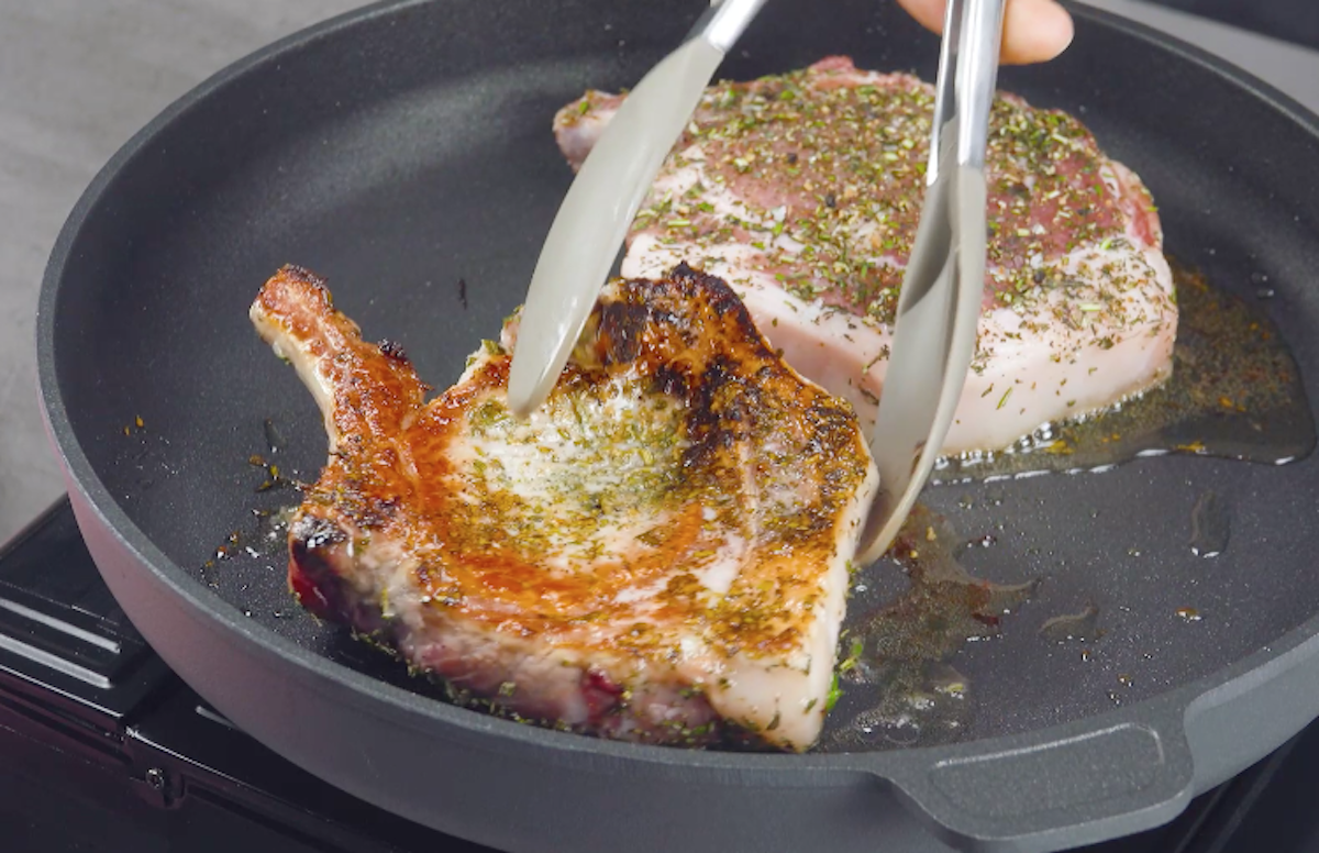 2. Erhitze Öl in einer Pfanne und brate die Schweinekoteletts darin von beiden Seiten an.