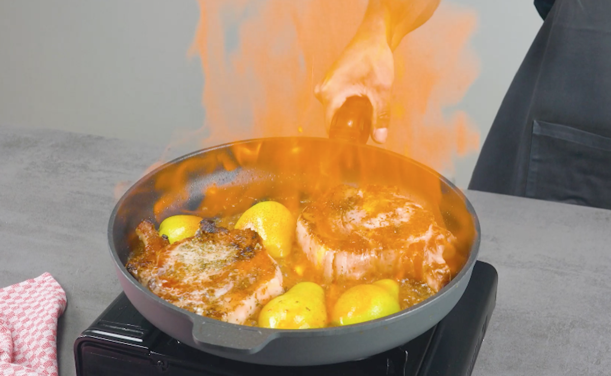 4. Gib nun einen Schuss Bourbon in die Pfanne und flambiere so Schweinekoteletts und Birnen.