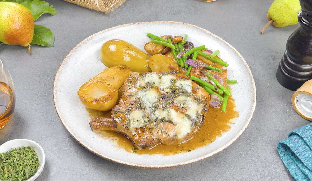 Es gibt besondere Gelegenheiten im Leben, die ein exquisites Mahl verdienen! Das nachfolgende Rezept eignet sich perfekt für einen Jahrestag, Geburtstag oder eine andere festliche Feier. Es ist zwar mühelos zuzubereiten, vermittelt jedoch den Eindruck von großer Kochkunst und schmeckt dazu noch himmlisch. Wir zaubern heute ein flambiertes Schweinekotelett in Bourbonsoße, begleitet von saftigen Birnen, zarten Kartoffeln, knackigen Bohnen und cremigem Gorgonzola.