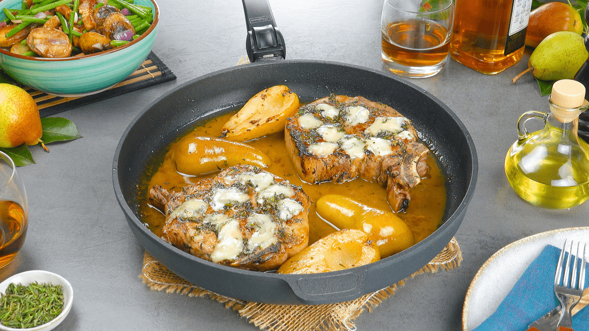 Durch das Flambieren entsteht ein herrlich rauchiges Aroma. Birne, Schweinekoteletts und Gorgonzola ergänzen sich nahezu perfekt. Ein Rezept, das wirklich alle Sinne befriedigt.