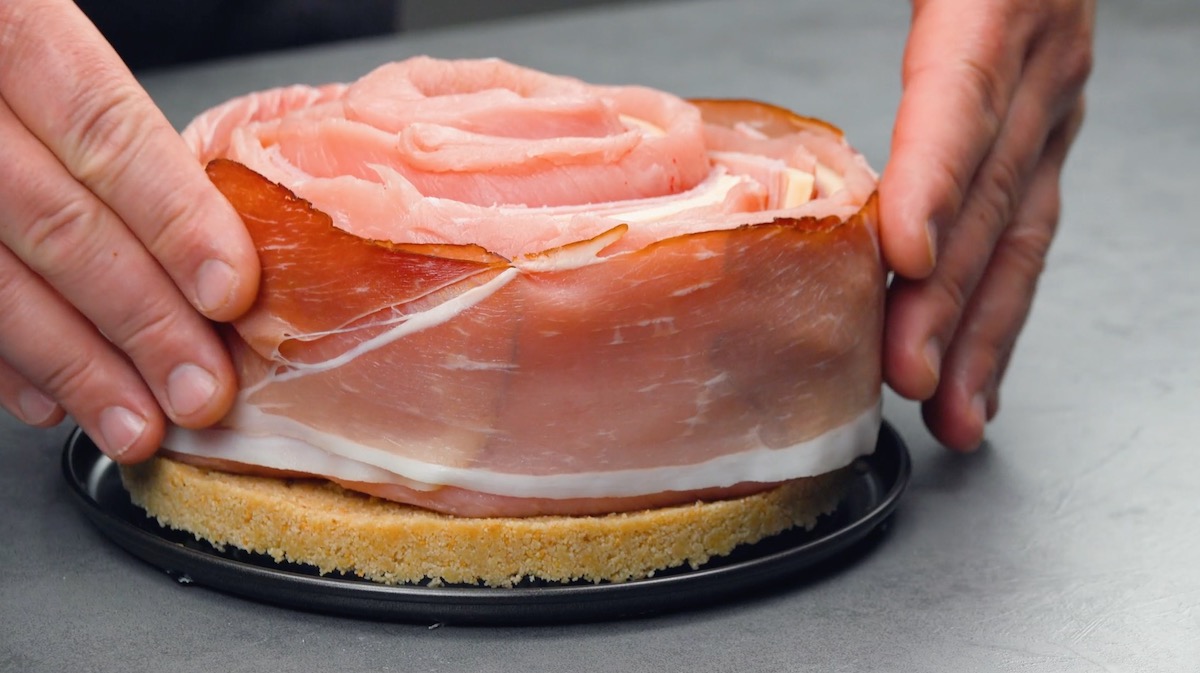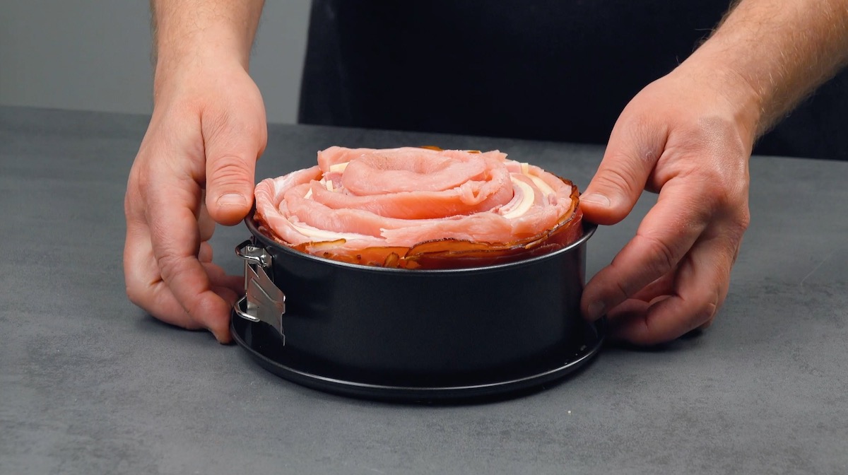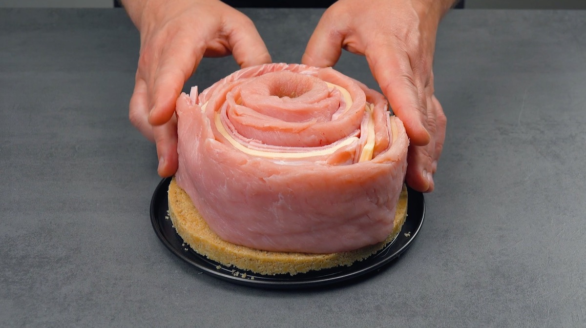 5. Nimm die vorbereitete Springform aus dem Kühlschrank, entferne den Rand und setze die Fleischspirale auf den Boden.
