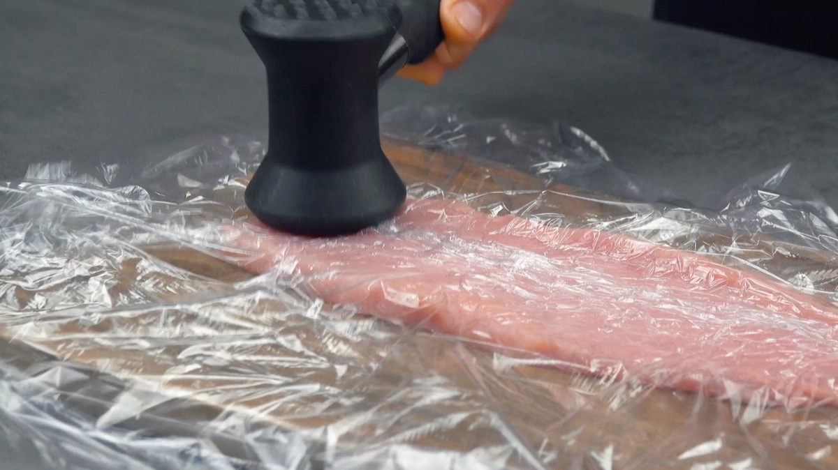 2. Schneide währenddessen den Schweinerücken längs in ca. 1,5 cm dicke Scheiben. Plattiere die Scheiben dann unter Frischhaltefolie.